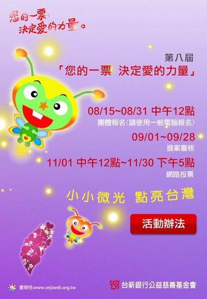 第八屆「您的一票,決定愛的力量」活動將自8/15起開放社福團體上網提案,活動分三階段:社福團體提案(2017/08/15~31)、邀請民眾上網投票(2017/11/01~30)、團體執行提案(2018/1/1~2018/11/30)。詳情請參考活動官網:http://www.poweroflove.com.tw/